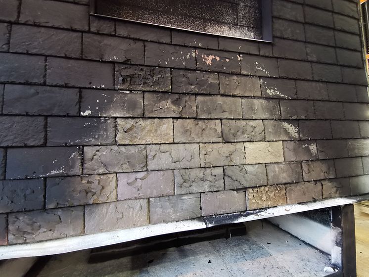 Närbild av takskifferfasaden ovanför brandrummet efter genomförd SPFire105 vid RISE