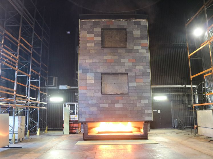 "Brandprovningen innebär att provföremålet utsätts för en simulerad lägenhetsbrand. I brännkammaren finns en brandkälla bestående av 60 liter heptan. Provet startas när heptanet antänds och varar tills det brunnit ut. Under provningen bedöms hur provföremålet påverkas av flamman som slår ut ur brandrummet. Det observeras hur provföremålet brinner och om något faller ner under provningen. Huruvida provföremålet i sig bidrar för mycket till branden mäts med hjälp av mätningar av värmeflöde mot centrum av det fiktiva fönstret i våningen ovanför brandrummet samt temperaturen vid takfoten. Efter provningen granskas hur högt upp som branden spridit sig."