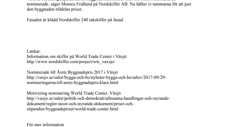 I Växjö kommun är det dags att avgöra vilken byggnad som tilldelas Årets Byggnadspris 2017. Bland de nominerade finns World Trade Center som har fasader klädda med skiffer från Nordskiffer.
