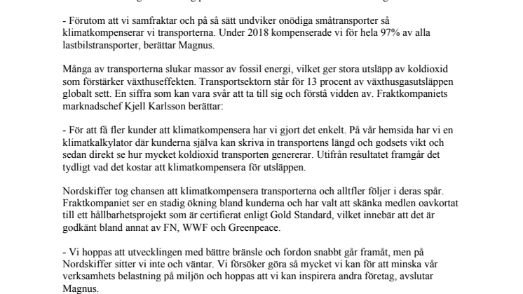 Nordskiffer tog chansen att klimatkompensera transporterna och alltfler följer i deras spår. Fraktkompaniet ser en stadig ökning bland kunderna och har valt att skänka medlen oavkortat till ett hållbarhetsprojekt som är certifierat enligt Gold Standard, vilket innebär att det är godkänt bland annat av FN, WWF och Greenpeace.