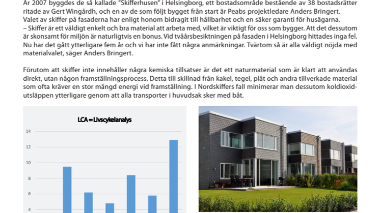När byggföretag talar om skiffer värdesätts ofta, förutom miljöaspekten, även funktion och låga kostnader. År 2007 byggdes de så kallade ”Skifferhusen” i Helsingborg, ett bostadsområde bestående av 38 bostadsrätter ritade av Gert Wingårdh, och en av de som följt bygget från start är Peabs projektledare Anders Bringert. Valet av skiffer på fasaderna har enligt honom bidragit till hållbarhet och en säker garanti för husägarna.