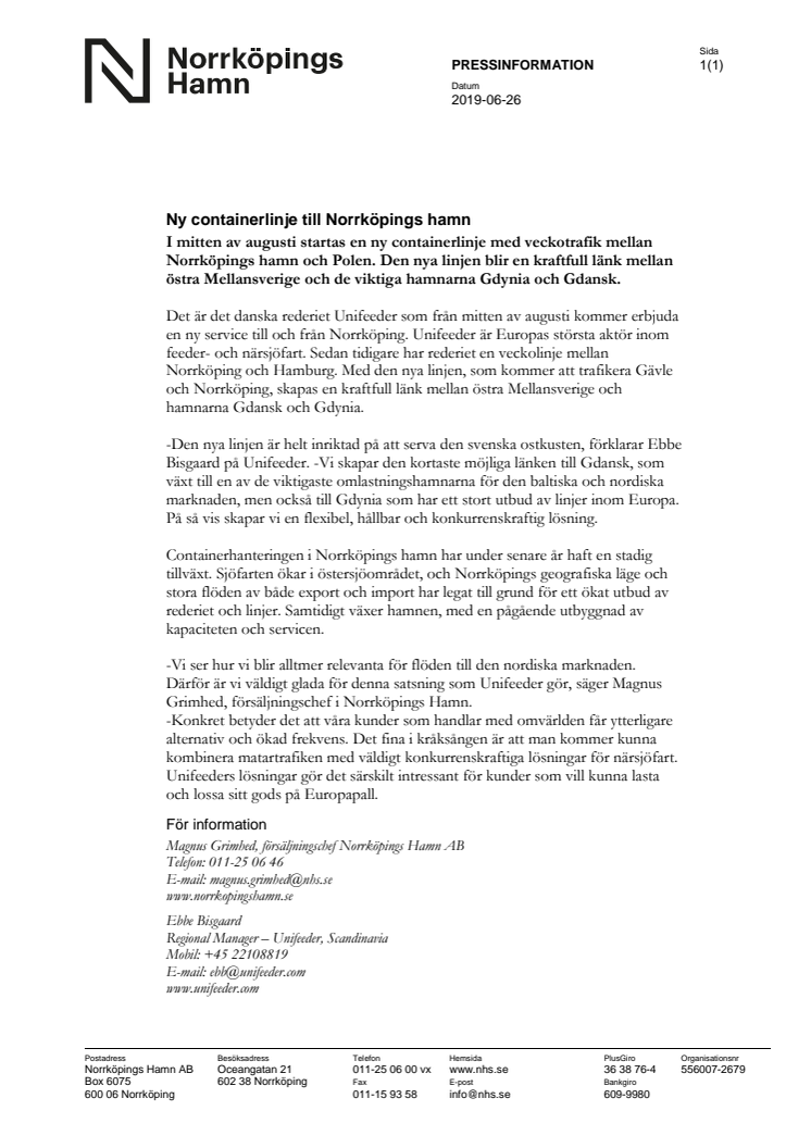 I mitten av augusti startas en ny containerlinje med veckotrafik mellan Norrköpings hamn och Polen. Den nya linjen blir en kraftfull länk mellan östra Mellansverige och de viktiga hamnarna Gdynia och Gdansk. Det är det danska rederiet Unifeeder som från mitten av augusti kommer erbjuda en ny service till och från Norrköping. Unifeeder är Europas största aktör inom feeder- och närsjöfart.