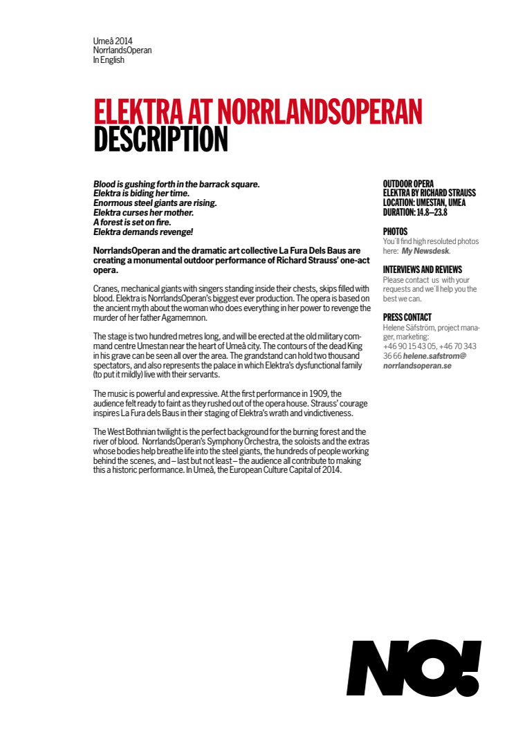 In August 2014 it´s time for the outdoor performance of Richard Strauss opera Elektra - the largest production of NorrlandsOperan ever - and one of the attractions of Umeå2014’s Capital of Culture.