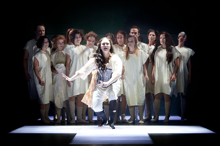 Miriam Treichl som Jane Avril, i bakgrunden NorrlandsOperans kör. Foto: Malin Arnesson