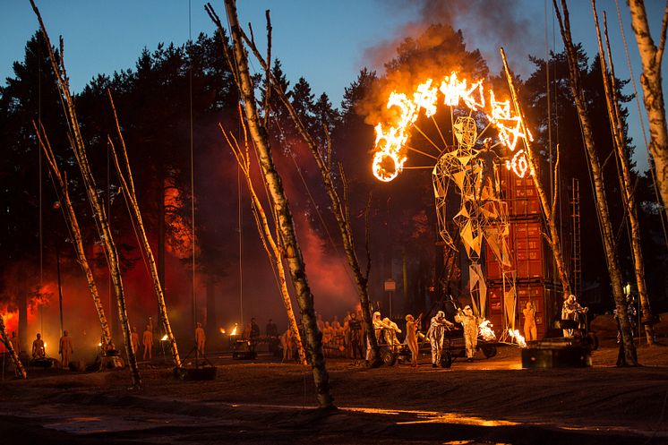 Thomas Lander (Orestes) gör entré på sin brinnande ståljätte.