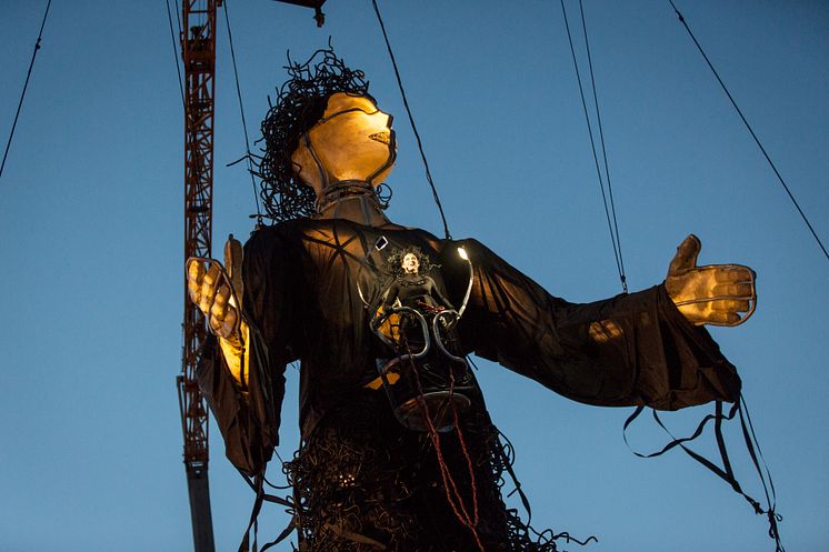 Ingela Brimberg som Elektra uppe i stäljätten.