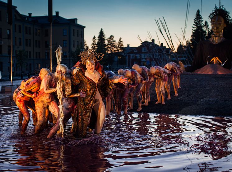 Ingrid Tobiasson (Klytaimnestra) följd av delar av föreställningens statister.