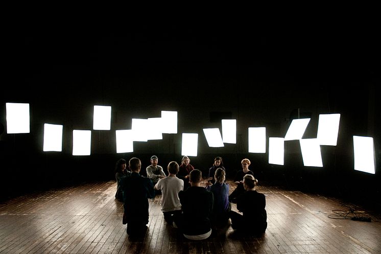 Fictional Copies av Björn Säfsten visas på NorrlandsOperan 28 och 29 mars. På bilden: Kenneth Bruun Carlssom, Sebastian Lingserius, Oskar Landström, Allison Ahl, Anja Arnquist i förgrunden med publik.