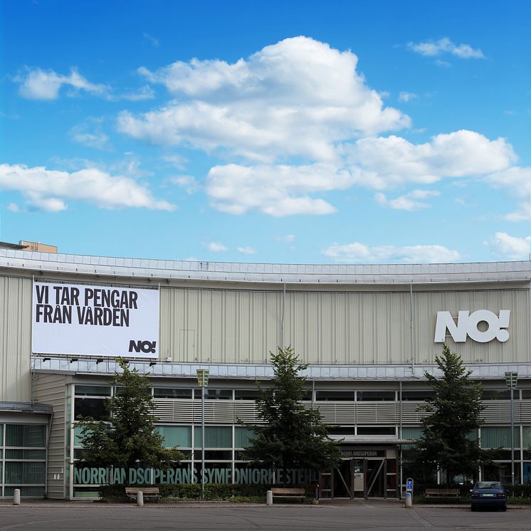 Vepa med texten "Vi tar pengar från vården" på NorrlandsOperans fasad