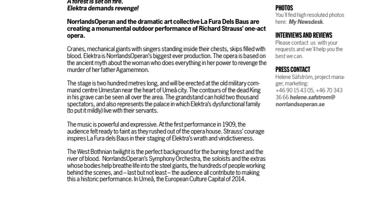 När Elektra sätts upp i Umeå 2014 blir det första gången i historien som operan görs i fullt format utomhus. Richard Strauss enaktsopera iscensätts av det katalanska scenkonstkollektivet La Fura dels Baus och publiken kan se fram emot en spektakulär utomhusföreställning i ett monumentalt format.