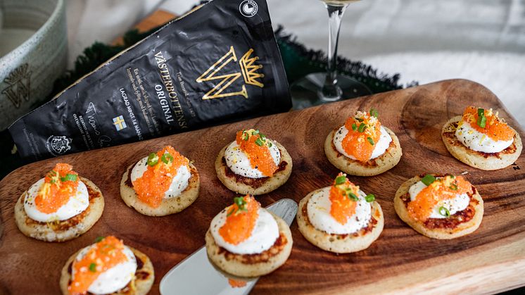 Som trevlig förrätt till nyårsafton, eller som ett gott tilltugg till adventsminglet har Sofia tagit fram ett recept med blinier med créme på Västerbottensost®