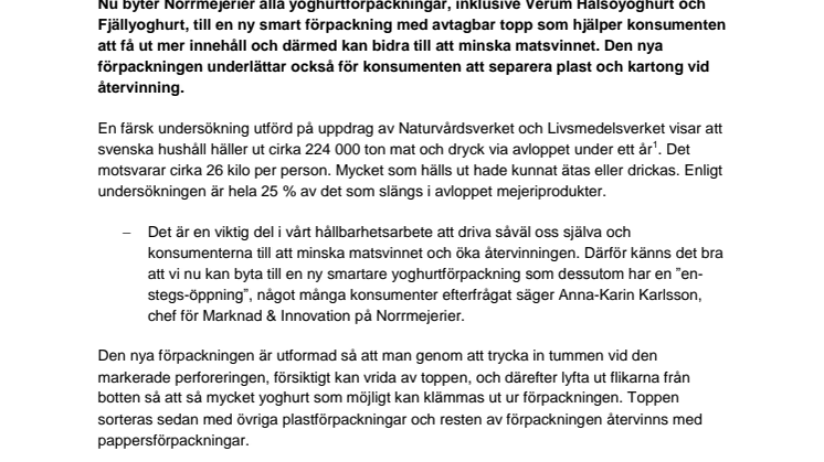 – Det är en viktig del i vårt hållbarhetsarbete att driva såväl oss själva och konsumenterna till att minska matsvinnet och öka återvinningen. Därför känns det bra att vi nu kan byta till en ny smartare yoghurtförpackning som dessutom har en ”en-stegs-öppning”, något många konsumenter efterfrågat säger Anna-Karin Karlsson, chef för Marknad & Innovation på Norrmejerier.