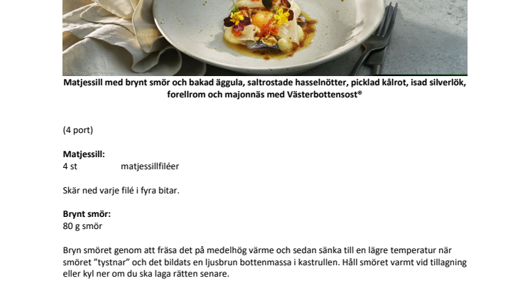 Matjessill med brynt smör och bakad äggula, saltrostade hasselnötter, picklad kålrot, isad silverlök, forellrom och majonnäs med Västerbottensost®