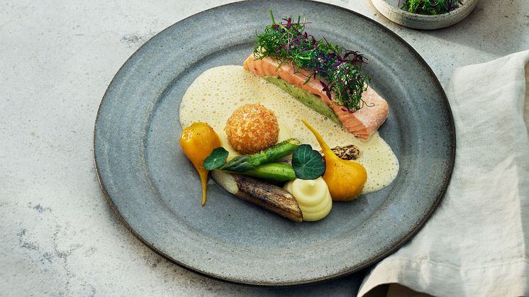 Ugnsbakad örtfärserad rödingfilé med potatispuré med Västerbottensost serveras med grön sparris, vit sotad sparris, gulbetor, en svampfylld krokett och champagnesås