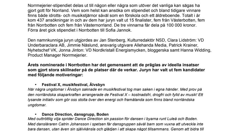 Norrmejerier-stipendiet delas ut till någon eller några som utöver det vanliga kan sägas ha gjort gott för Norrland. Vem som helst kan ansöka om stipendiet och bland tidigare vinnare finns både idrotts- och musikstjärnor såväl som en förskola och ett äldreboende. Totalt i år kom 437 ansökningar in och av dem har juryn valt ut 15 finalister, fem från Västerbotten, fem från Norrbotten och fem från Västernorrland. De tre vinnarna får dela på 100 000 kronor. Förra året gick stipendiet i Norrbotten till Sofia Jannok.