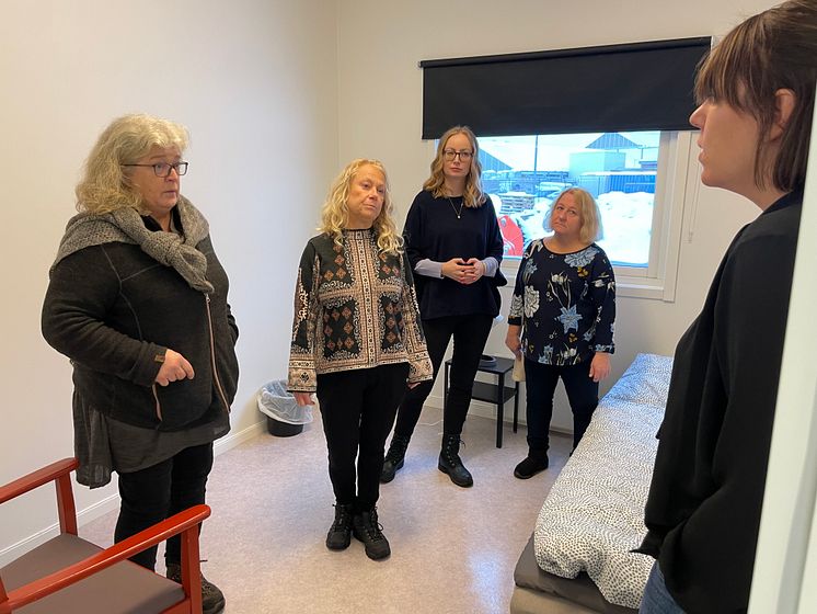 Åsa Wennerfors (L), Ann Lewerentz (M), Andrea Kronvall (SD) och Annika Olegård (KD) från socialnämnden får information om boendet av verksamhetschefen Sara Karlsson.