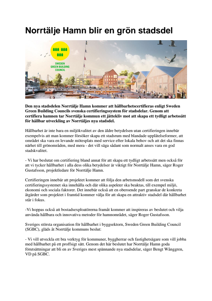 - Vi vill utveckla ett bra verktyg för kommuner, byggherrar och fastighetsägare som vill jobba med hållbarhet på ett proffsigt sätt. Genom det här beslutet har Norrtälje Hamn goda förutsättningar att bli en av Sveriges mest spännande nya stadsdelar, säger Bengt Wånggren, VD på SGBC.