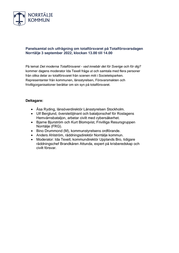 Syftet med Totalförsvarsdagen är att visa hur vi tillsammans bygger ökad förmåga och motståndskraft och att alla i Norrtälje kommun och Sverige har en viktig roll. Klockan 13 till 14 blir det samtal och paneldiskussioner från scenen med företrädare för kommunen, Länsstyrelsen, Försvarsmakten och frivilligorganisationer (för deltagare se dokument nedan). Ett 20-tal organisationer, både civila och militära, finns på plats och berättar och visar upp sin verksamhet.