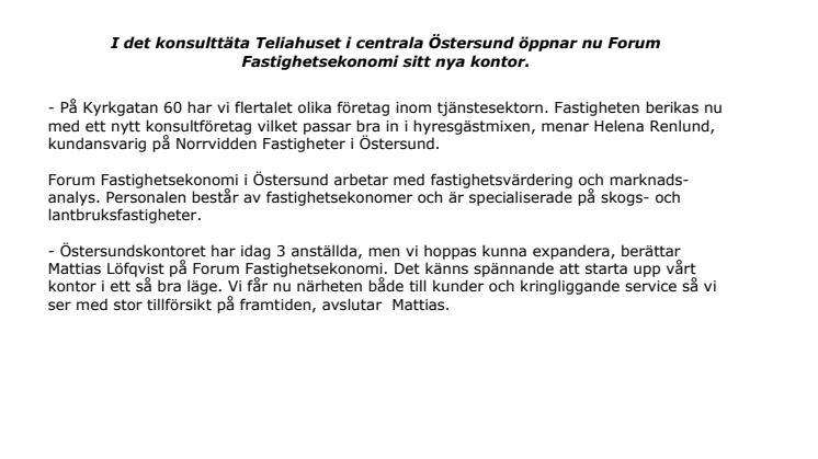 I det konsulttäta Teliahuset i centrala Östersund öppnar nu Forum Fastighetsekonomi sitt nya kontor.