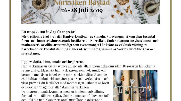 För trettionde året i rad går Hantverksmässan av stapeln. Ett evenemang som drar tusentals form- och hantverksintresserade besökare till Norrviken. Under dagarna tre visas konst- och mathantverk av olika art samtidigt som evenemanget i år kröns av exklusiv visning av barocka föremål, konstutställning signerad 2xGynning, visning av World Car of the Year och mycket mer.