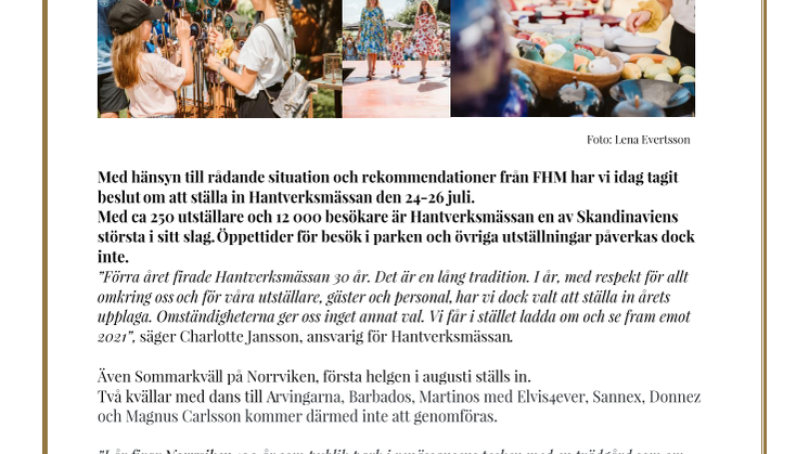 Med hänsyn till rådande situation och rekommendationer från FHM har vi idag tagit beslut om att ställa in Hantverksmässan den 24-26 juli.