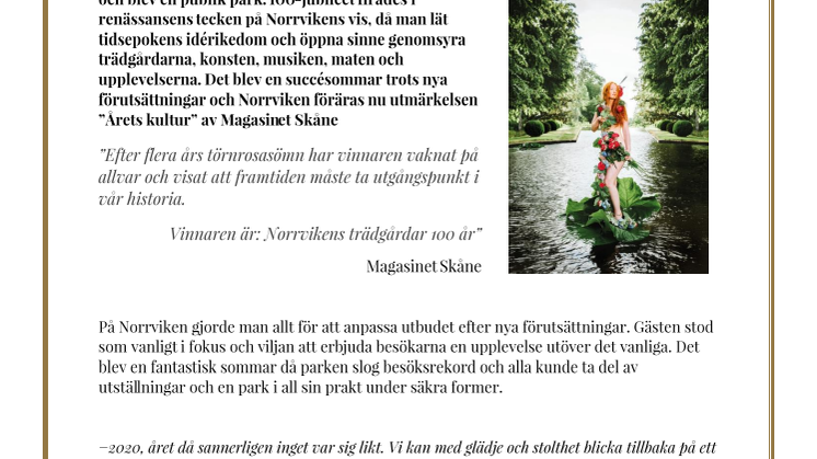 1920 öppnades Norrvikens trädgårdar för allmänheten och blev en publik park. 100-jubiléet firades i renässansens tecken på Norrvikens vis, då man lät tidsepokens idérikedom och öppna sinne genomsyra trädgårdarna, konsten, musiken, maten och upplevelserna. Det blev en succésommar trots nya förutsättningar och Norrviken föräras nu utmärkelsen ”Årets kultur” av Magasinet Skåne