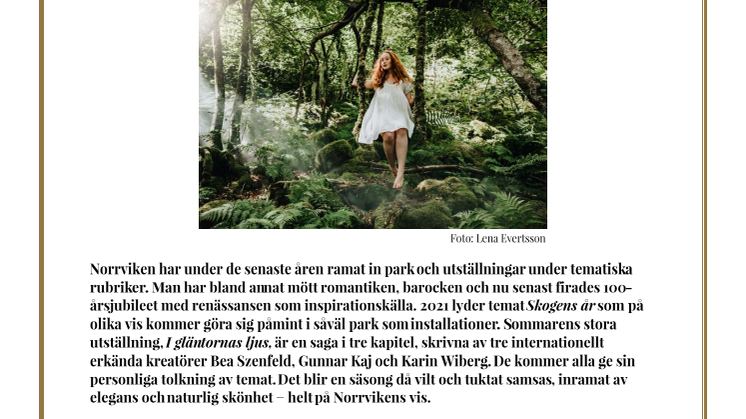 Norrviken har under de senaste åren ramat in park och utställningar under tematiska rubriker. Man har bland annat mött romantiken, barocken och nu senast firades 100-årsjubileet med renässansen som inspirationskälla. 2021 lyder temat Skogens år som på olika vis kommer göra sig påmint i såväl park som installationer. Sommarens stora utställning, I gläntornas ljus, är en saga i tre kapitel, skrivna av tre internationellt erkända kreatörer Bea Szenfeld, Gunnar Kaj och Karin Wiberg. De kommer alla ge sin personliga tolkning av temat. Det blir en säsong då vilt och tuktat samsas, inramat av elegans och naturlig skönhet − helt på Norrvikens vis.