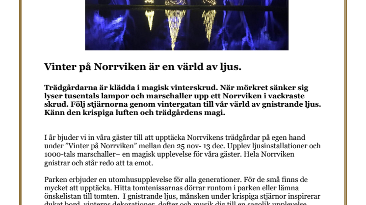 I år bjuder vi in våra gäster till att upptäcka Norrvikens trädgårdar på egen hand under ”Vinter på Norrviken” mellan den 25 nov- 13 dec. Upplev ljusinstallationer och 1000-tals marschaller− en magisk upplevelse för våra gäster. Hela Norrviken gnistrar och står redo att ta emot.