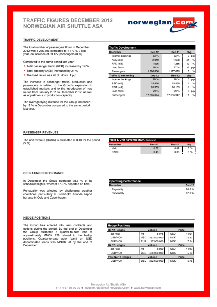 Norwegian flög närmare 17,7 miljoner passagerare under 2012, en ökning med 13 procent jämfört med föregående år. Under december månad flög över 1,2 miljoner passagerare, en ökning på 8 procent jämfört med samma månad föregående år.