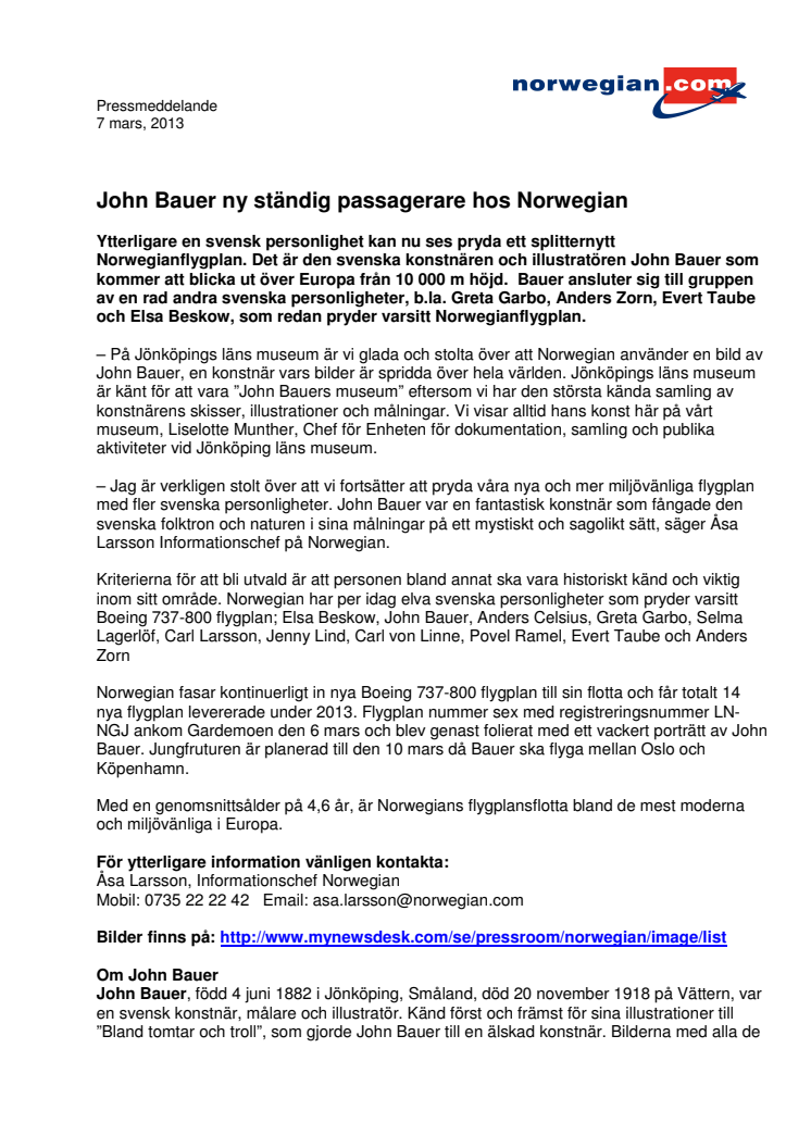 Ytterligare en svensk personlighet kan nu ses pryda ett splitternytt Norwegianflygplan. Det är den svenska konstnären och illustratören John Bauer som kommer att blicka ut över Europa från 10 000 m höjd. Bauer ansluter sig till gruppen av en rad andra svenska personligheter, b.la. Greta Garbo, Anders Zorn, Evert Taube och Elsa Beskow, som redan pryder varsitt Norwegianflygplan.
