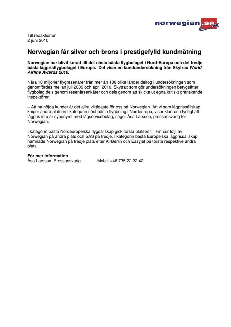 Norwegian har blivit korad till det näst bästa flygbolaget i Nordeuropa och det tredje bästa lågprisflygbolaget i Europa. Det visar en kundundersökning från Skytrax World Airline Awards 2010.
