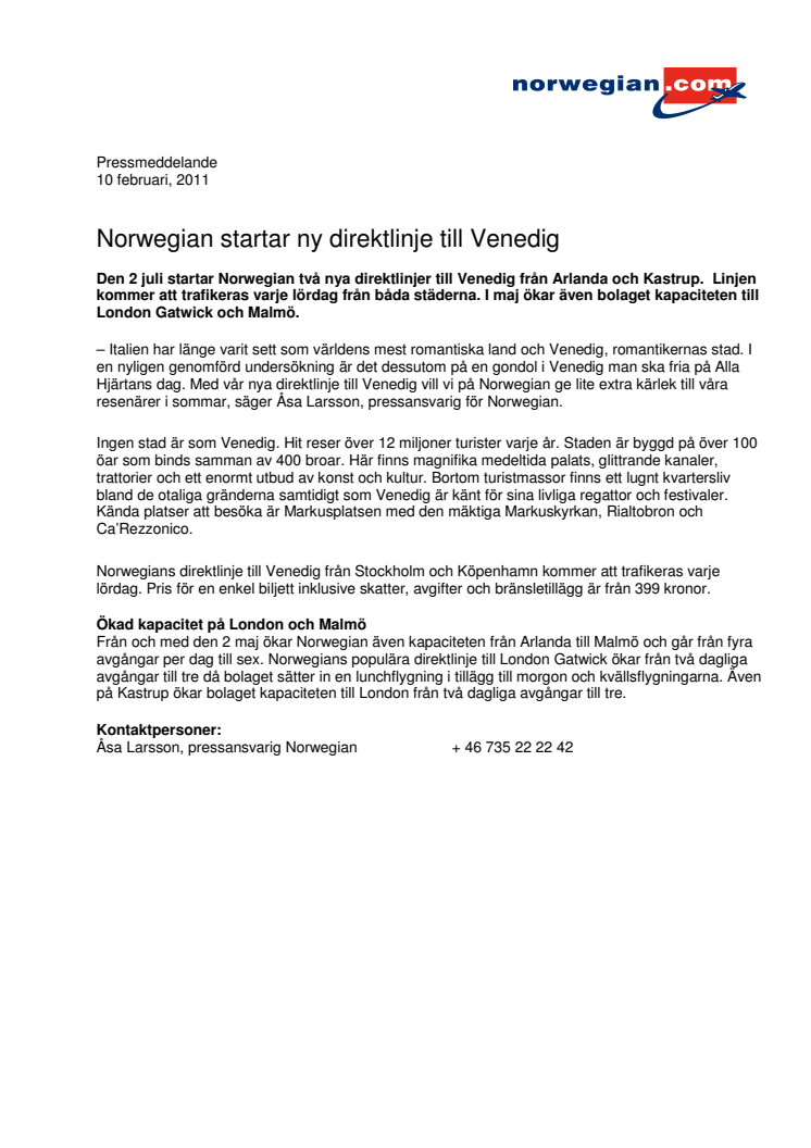Den 2 juli startar Norwegian två nya direktlinjer till Venedig från Arlanda och Kastrup. Linjen kommer att trafikeras varje lördag från båda städerna. I maj ökar även bolaget kapaciteten till London Gatwick och Malmö.