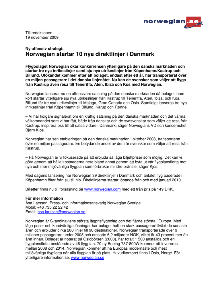 Flygbolaget Norwegian ökar konkurrensen ytterligare på den danska marknaden och startar tre nya inrikeslinjer samt sju nya utrikeslinjer från Köpenhamn/Kastrup och Billund. Utökandet kommer efter att bolaget, endast efter ett år, har transporterat över en miljon passagerare i det danska linjenätet. Nu kan de svenskar som väljer att flyga från Kastrup även resa till Teneriffa, Aten, Ibiza och Kos.