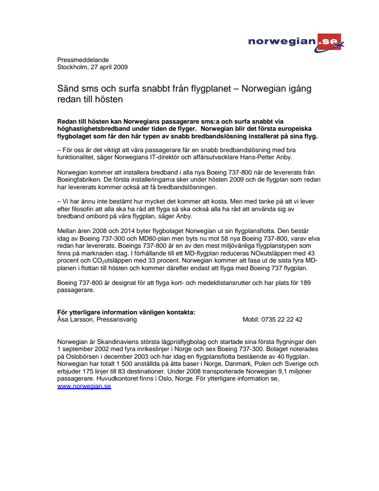 Redan till hösten kan Norwegians passagerare sms:a och surfa snabbt via höghastighetsbredband under tiden de flyger. Norwegian blir det första europeiska flygbolaget som får den här typen av snabb bredbandslösning installerat på sina flyg.
