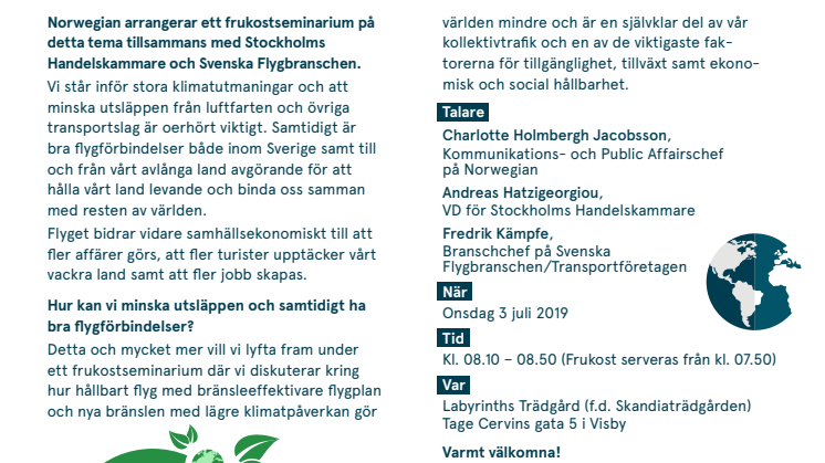 Detta och mycket mer vill vi lyfta fram under ett frukostseminarium där vi diskuterar kring hur hållbart flyg med bränsleeffektivare flygplan och nya bränslen med lägre klimatpåverkan gör världen mindre och är en självklar del av vår kollektivtrafik och en av de viktigaste faktorerna för tillgänglighet, tillväxt samt ekonomisk och social hållbarhet.