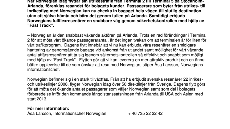 – Norwegian är den snabbast växande aktören på Arlanda. Trots en rad förändringar i Terminal 2 för att möta vårt ökande passagerarantal, är det ingen tvekan om att terminalen är för liten för vårt trafikprogram. Dagens flytt innebär att vi nu kan erbjuda våra resenärer en smidigare hantering av genomgående bagage vid ankomst från utlandet samt möjlighet för vårt växande antal affärsresenärer att ta sig igenom säkerhetskontrollen så effektivt och snabbt som möjligt med hjälp av ”Fast Track”. Flytten gör att vi kan leverera en mer attraktiv produkt och en ännu bättre upplevelse till de som önskar att resa med Norwegian, säger Åsa Larsson, Norwegians informationschef.