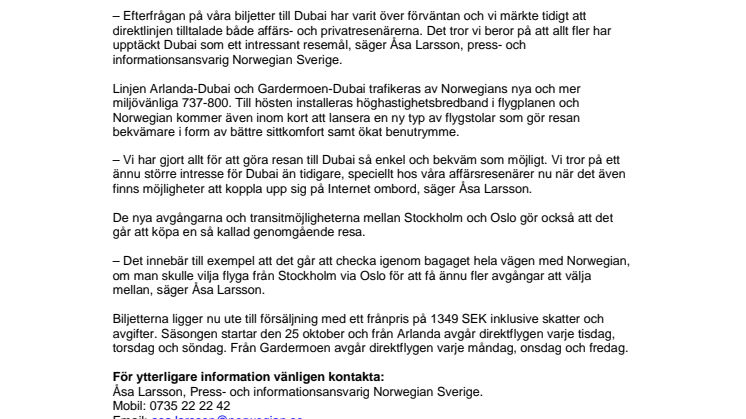 - Efterfrågan på våra biljetter till Dubai har varit över förväntan och vi märkte tidigt att direktlinjen tilltalade både affärs- och privatresenärerna. Det tror vi beror på att allt fler har upptäckt Dubai som ett intressant resemål, säger Åsa Larsson, press- och informationsansvarig Norwegian Sverige.