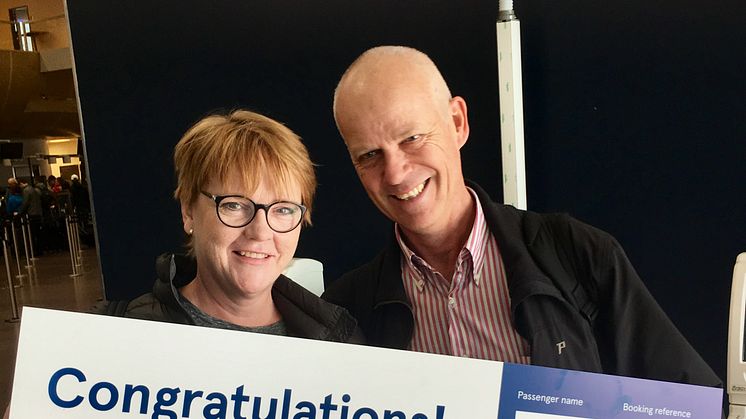 Evastina Lönngern som var på väg till London med sin man Mats Lönngren, överraskades med att vara Norwegians passagerare nummer 38 miljoner på Arlanda. I present får hon två tur- och returbiljetter i Premium till valfri långlinjedestination med Norwegian.