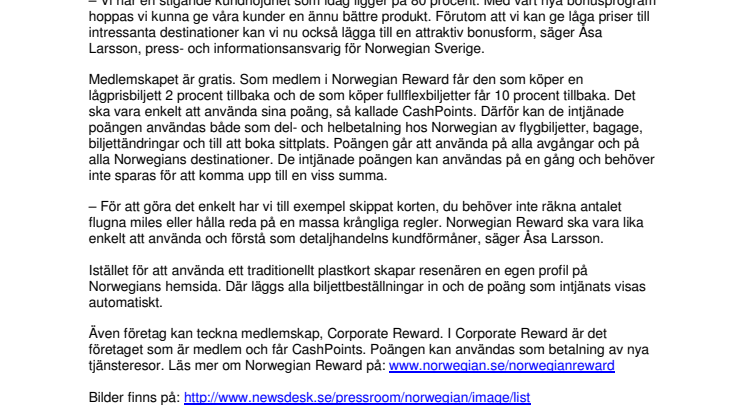 - Vi har en stigande kundnöjdhet som idag ligger på 80 procent. Med vårt nya bonusprogram hoppas vi kunna ge våra kunder en ännu bättre produkt. Förutom att vi kan ge låga priser till intressanta destinationer kan vi nu också lägga till en attraktiv bonusform, säger Åsa Larsson, press- och informationsansvarig för Norwegian Sverige.