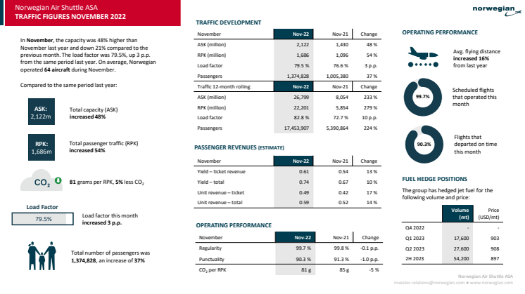 I november hade Norwegian 1 374 828 passagerare, en ökning med 37 procent jämfört med november förra året. Kabinfaktorn var på 79,5 procent. Kapaciteten (ASK) var 2 122 miljoner säteskilometer i november medan faktiskt passagerartrafik (RPK) var 1 686 miljoner säteskilometer. Norwegian hade i genomsnitt 64 flygplan i drift i november och 99,7 procent av de schemalagda flygningarna genomfördes. Punktligheten, som mäter antal avgångar som avgår inom 15 minuter efter ordinarie tidtabell, var på 90,3 procent i november.