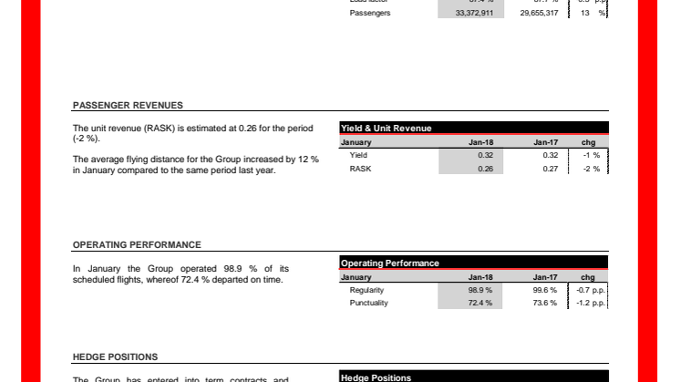 Totalt valde 2 333 932 passagerare att flyga med Norwegian i januari vilket är 223 356 fler än samma månad förra året. Den totala trafiktillväxten (RPK) ökade med 29 procent och kapacitetstillväxten (ASK) ökade med 30 procent. Kabinfaktorn var på 82 prosent, ned en procentenhet.