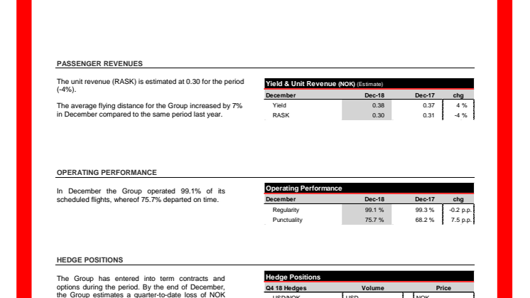Även årets sista månad präglades av passagerartillväxt. I december valde 2 771 135 passagerare att resa med Norwegian vilket är 15 procent fler än samma månad föregående år. Kapacitetstillväxten (ASK) i december var på 34 procent och trafiktillväxten (RPK) på 24 procent. Kabinfaktorn var på 78,6 procent. Totalt genomförde Norwegian 99,1 procent av de planlagda flygningarna i december varav 75 procent gick enligt tidtabell.