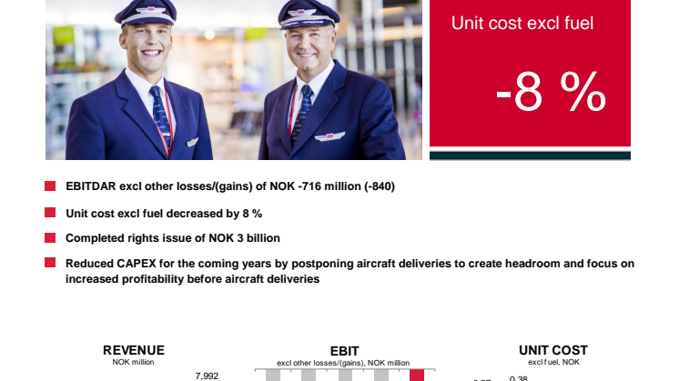 Norwegian presenterar i dag ett kvartalsresultat präglat av lägre kostnader, ökade intäkter och en betydligt bättre punktlighet. Bolagets enhetskostnader exklusive bränsle minskade med åtta procent jämfört med samma period förra året. Omsättningen var på åtta miljarder NOK, upp 14 procent.