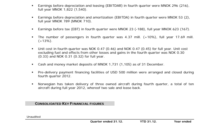 Norwegian omsatte 3,1 miljarder norska kronor under fjärde kvartalet 2012, en ökning på 22 procent jämfört med samma period föregående år. Resultatet före skatt (EBT) hamnade på 23 miljoner norska kronor, 211 miljoner bättre än 2011. 4,37 miljoner passagerare flög med bolaget under fjärde kvartalet, en passagerartillväxt på 10 procent.