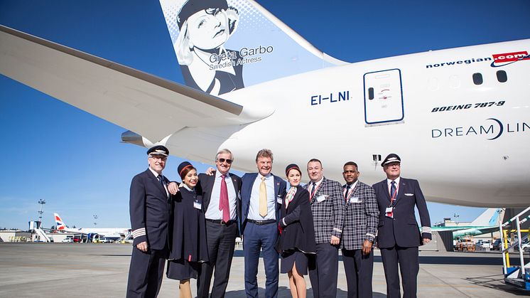Den svenska skådespelaren Greta Garbo pryder planets stjärtfena. Den första kommersiella flygningen går från Oslo till Orlando i Florida 27 februari. Norwegian leasar planet från det New York-baserade leasingbolaget MG Aviation.