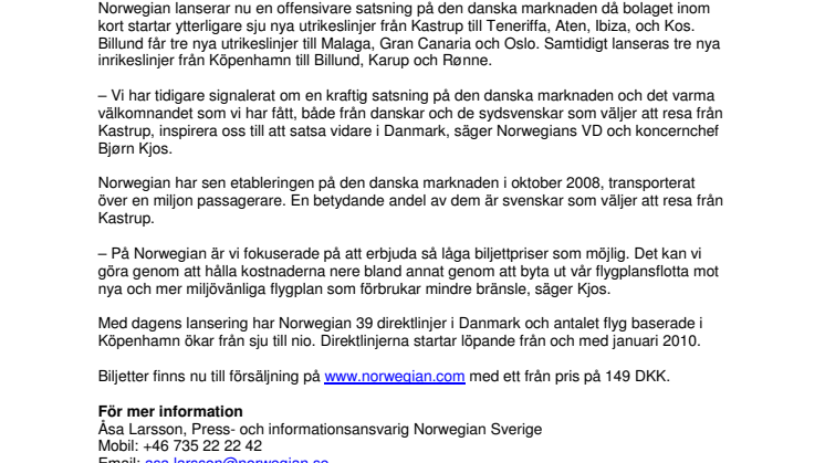 Med dagens lansering har Norwegian 39 direktlinjer i Danmark och antalet flyg baserade i Köpenhamn ökar från sju till nio. Direktlinjerna startar löpande från och med januari 2010.