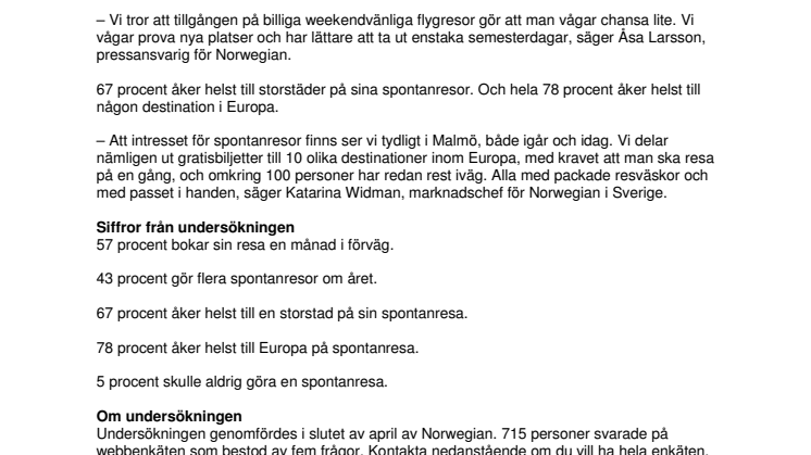 – Att intresset för spontanresor finns ser vi tydligt i Malmö, både igår och idag. Vi delar nämligen ut gratisbiljetter till 10 olika destinationer inom Europa, med kravet att man ska resa på en gång, och omkring 100 personer har redan rest iväg. Alla med packade resväskor och med passet i handen, säger Katarina Widman, marknadschef för Norwegian i Sverige.