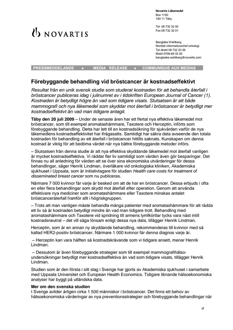 Resultat från en unik svensk studie som studerat kostnaden för att behandla återfall i bröstcancer publiceras idag. Kostnaden är betydligt högre än vad som tidigare visats. Slutsatsen är att både mammografi och nya läkemedel som skyddar mot återfall i bröstcancer är betydligt mer kostnadseffektivt än vad man tidigare antagit.
