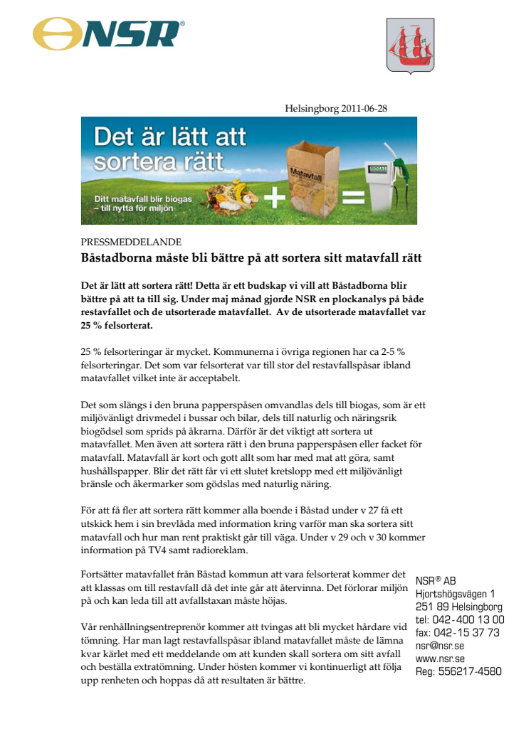 Det är lätt att sortera rätt! Detta är ett budskap vi vill att Båstadborna blir bättre på att ta till sig. Under maj månad gjorde NSR en plockanalys på både restavfallet och de utsorterade matavfallet. Av de utsorterade matavfallet var 25 % felsorterat.