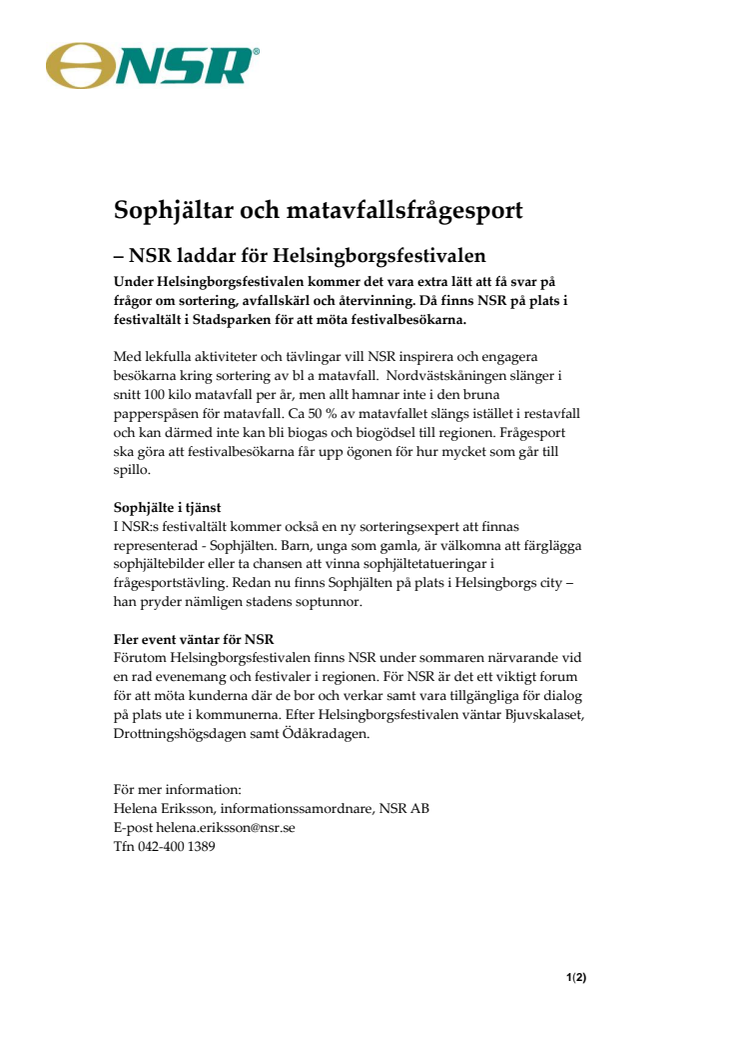 Under Helsingborgsfestivalen kommer det vara extra lätt att få svar på frågor om sortering, avfallskärl och återvinning. Då finns NSR på plats i festivaltält i Stadsparken för att möta festivalbesökarna. Förutom Helsingborgsfestivalen finns NSR under sommaren närvarande vid en rad evenemang och festivaler i regionen.